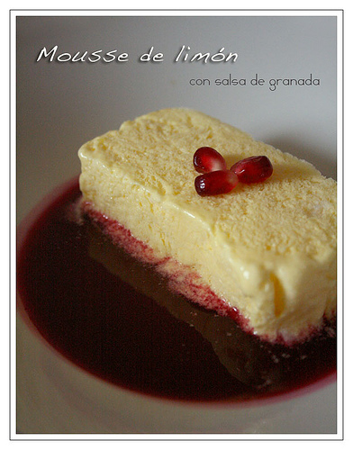 Un poco antes de servir sacar la mousse del congelador. Disponer la salsa templada en el fondo del plato y una “rebanada” de mousse encima. Decorar con unos granos de granada y servir inmediatamente.