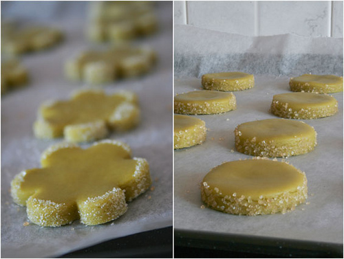 Formar una bola, envolverla en film transparente y dejarla reposar en el frigo durante 30 minutos. Extender con el rodillo hasta una altura de aprox. 1 cm, cortar las galletas con el molde que más nos guste (yo las he hecho con forma de estrella y redondas :), pasar los bordes por el azúcar, disponerlos en una bandeja de horno forrada con papel de horno y cocerlos en el horno caliente a 180° durante 15 minutos o hasta que los bordes estén ligeramente dorados.