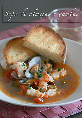 Incorporar el líquido de las almejas, el caldo de las gambas y las gambas cortadas en dos o tres trocitos.