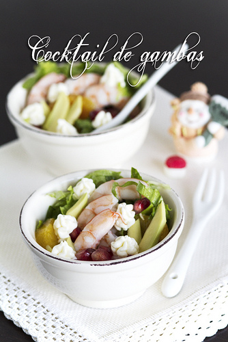 4 Montar los cocktails justo antes de servir: aliñar la lechuga y montar cada cocktail como más nos guste con los langostinos, los gajos de naranja, el aguacate, un poco de granada y la mayonesa (que podemos meter en una manga pastelera con una boquilla en forma de estrella).