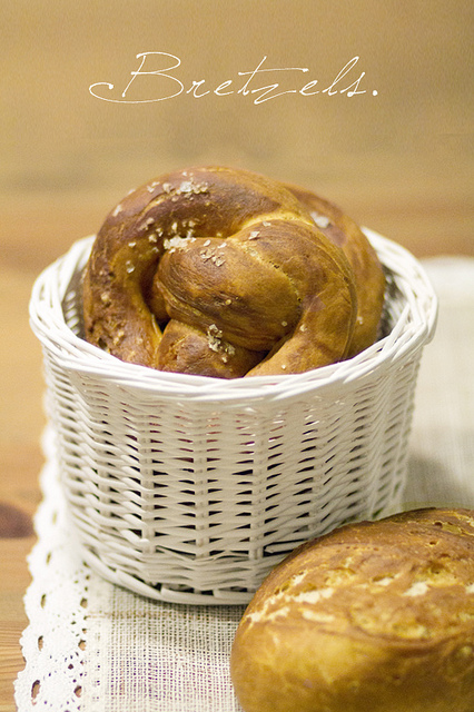 Para los que aún no los hayáis probado (tenéis que hacerlos!! :) os cuento que es un pan de origen Alemán con forma de rueda con un brazo retorcido :P buenísimo. Lo que lo hace especial es la costra crujiente, oscura y con un sabor muy especial que le da el baño en agua y bicarbonato antes de meterlos en el horno. Es uno de mi panes preferidos… por no decir MI preferido… Lo mejor de lo mejor es tomarlo acompañando unas ricas salchichas alemanas, choucroute y una buena cerveza. Wow!